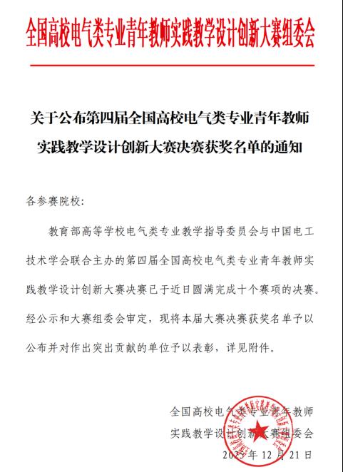 近日,2025年第四届全国高校电气类专业青年教师实践教学设计创新大赛决赛在浙江温州圆满落幕。大赛由教育部高等学校电气类专业教学指导委员会、中国电工技术学会主办。本次大赛共有10个赛项,522支队伍报名,306支队伍晋级决赛,选手来自全国21个省市。我校BBIN宝盈集团鞠晓君、晋宏炎、昝玉鹏老师组成的教学团队凭借《基于机智云的嵌入式系统实训开发平台》项目,在“电气自动化系统创新设计竞赛”赛道中荣获全国总决赛二等奖。